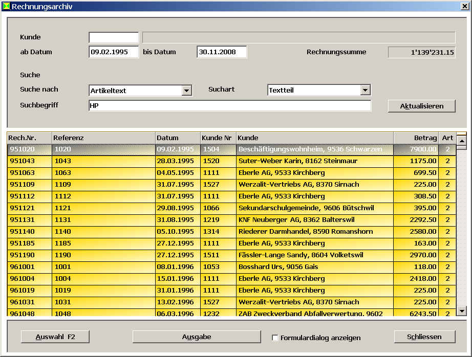 Im Rechnungsarchiv lassen sich Dokumente nach verschiedenen Kriterien wieder finden. In unserem Beispiel werden Dokumente gesucht, welche im Artikeltext den Wortteil ‚HP’ enthalten. Diese Dokumente können als Originalformular wieder neu ausgedruckt oder direkt als PDF per E-Mail an den Kunden gesandt werden.
