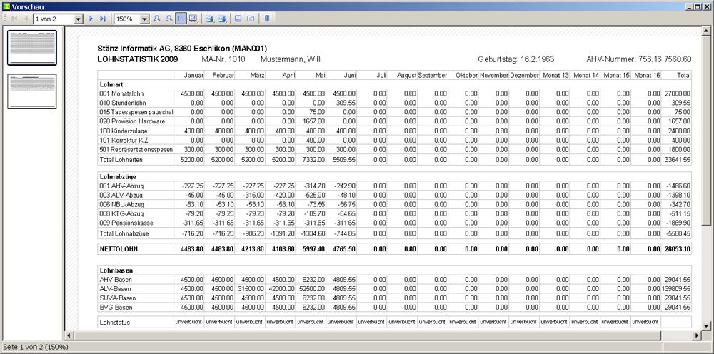 Für interne oder externe Kontrollen und Revisionen bietet die Mitarbeiterstatistik Informationen zu Lohnbestandteilen, Lohnabzügen und Lohnbasen.