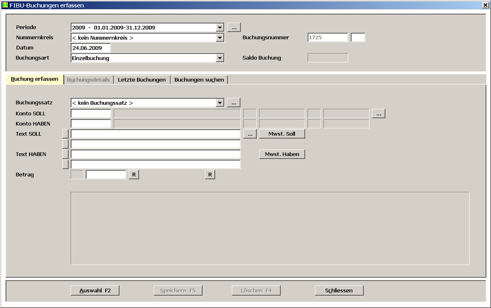 Im Buchungsfenster bleibt alles fast beim Alten. Es lassen sich einfach und schnell die gewünschten Buchungen machen. Unter ‚Letzte Buchungen’ können alle Buchungen der aktuellen Periode angezeigt werden (auch hier natürlich mit Spaltensortierung). Unter ‚Buchungen suchen’ lassen Buchungen via Textteil, Konto, Betrag etc. suchen und finden.
