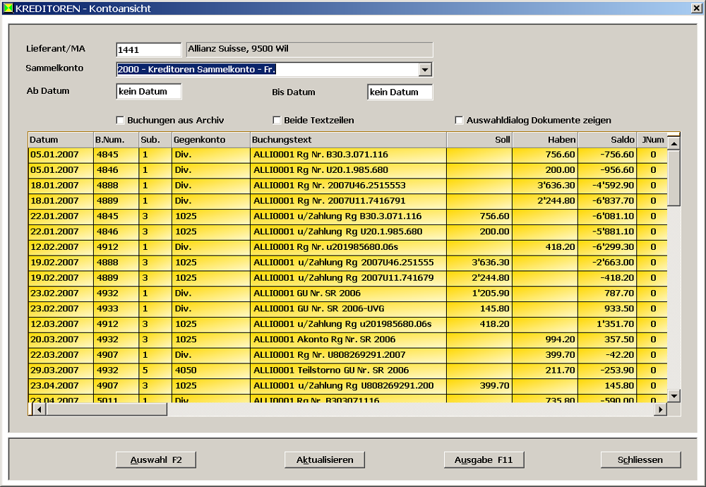 Einfach lässt sich das Kontoblatt eines Lieferanten anzeigen. Sichtbar sind alle Buchungen und Zahlungen. Sichtbar ist auch der Status jeder Buchung.