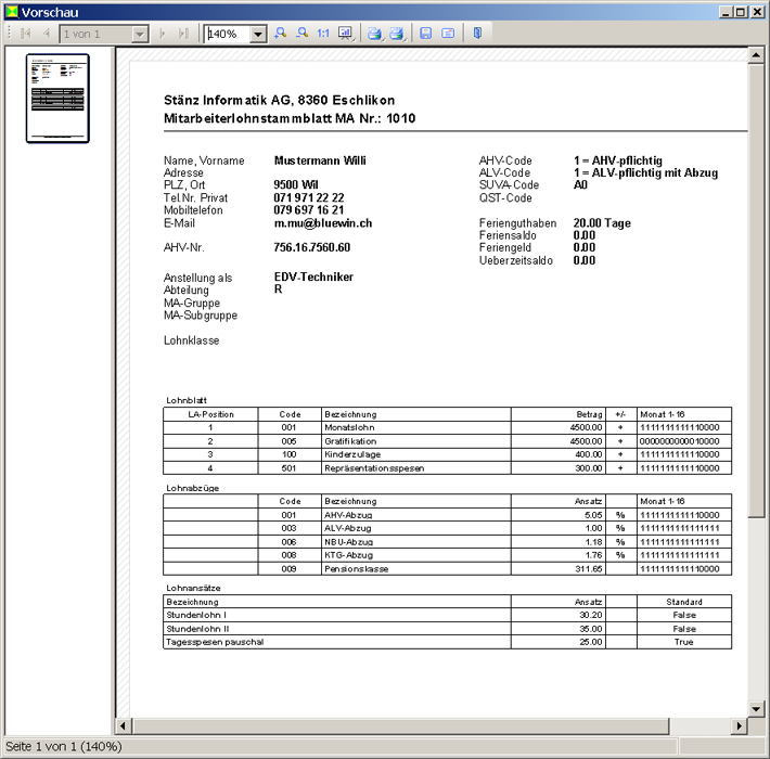 Zu den persönlichen Daten und den Firmendaten des Mitarbeiters können auf dem Mitarbeiterlohnstammblatt auch die Lohnbestandteile und Lohnabzüge ausgegeben werden.