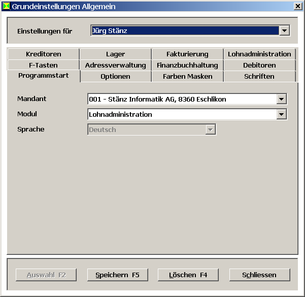 Verschiedene Grundeinstellungen lassen sich für alle Anwender oder aber für einzelne Anwender ablegen. So kann z.B. Anwender*A* Mandant 005 und Modul FIBU, Anweder*B* Mandant 002 und Modul LOHN für den Programmstart hinterlegen.