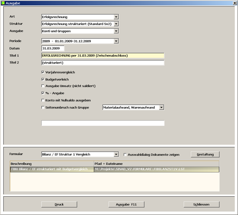 Neben Kontoblättern, Journalen, Mehrwertsteuerabrechnung etc. kann neu auch eine ‚strukturierte Erfolgsrechnung’ generiert werden. SINAD liefert eine Standardstruktur mit - es können aber auch eigene Strukturen gebildet werden. So könnte aus der Erfolgsrechnung nur der Teil ‚Liegenschaften’ ausgegeben werden.